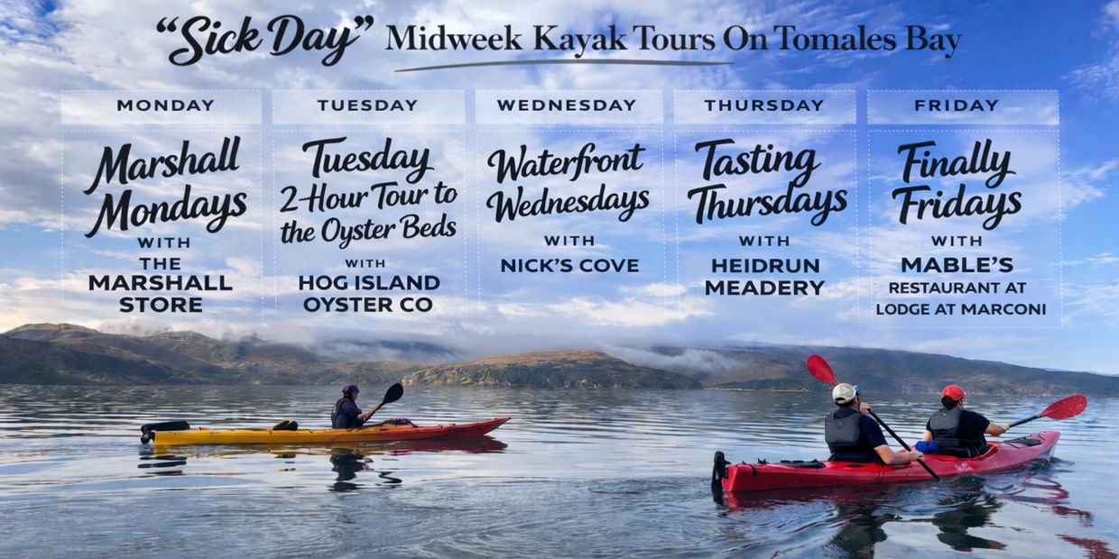 End the "work week" or start your weekend early with a 2-hour kayaking tour and then head over to Mable's Restaurant at the Lodge at Marconi for their tasty brunch on the patio overlooking Tomales Bay. Brunch not your thing? You can also take a hike on the trails of the Lodge at Marconi after your tour and then hit up Mable's Happy Hour.